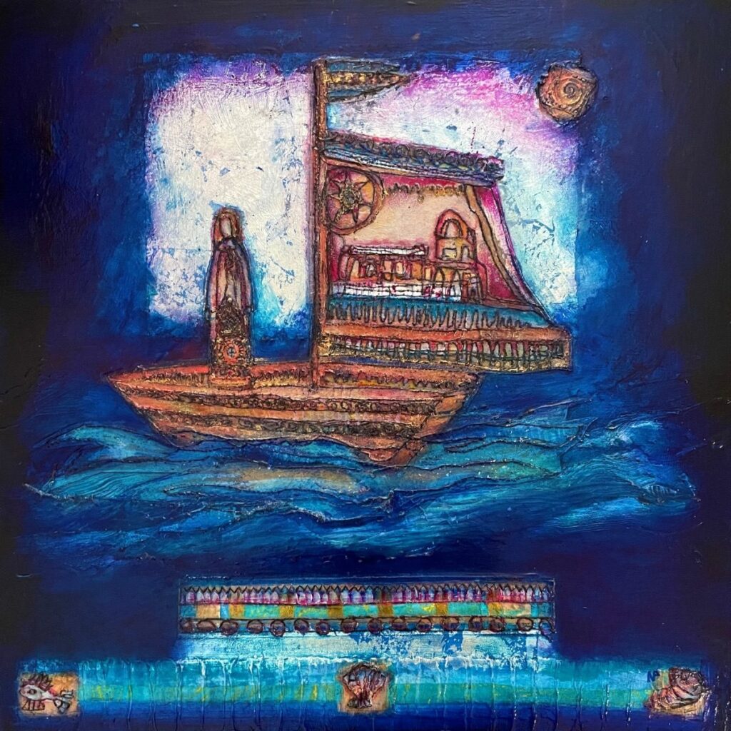 Narelle works in many mediums and has developed a practice which fuses and extends the processes and disciplines of drawing, printmaking, painting and textiles, with an emphasis on the interplay of surface, material and texture. An integral part of her work is the concept and activity of layering – dyed, printed and painted materials, often transparent and translucent, are stitched and embellished with embossed shims and printed surfaces. Acrylic and oil media are then subtley layered over these pieces to create highly worked and jewel-like surfaces.