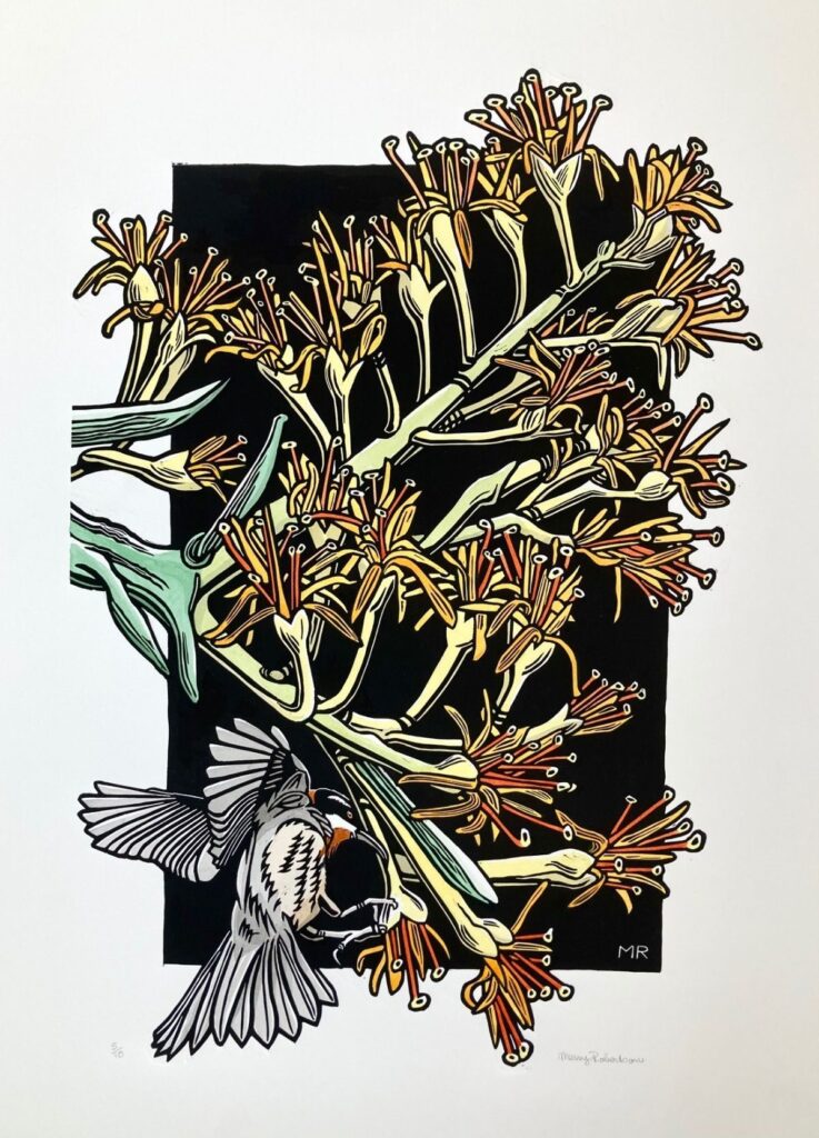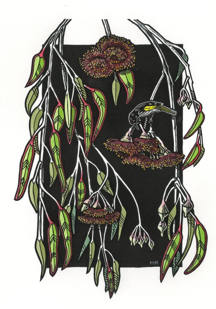 I have a focus on endangered flora and fauna species of the region, rendering these in linocuts, drawings, etchings and books, often with poetry to accompany the images. A major influence is still my four years spent as a Guide for the Art Gallery of WA. A percentage of all my arts sales is donated to a number of environmental protection organisations.