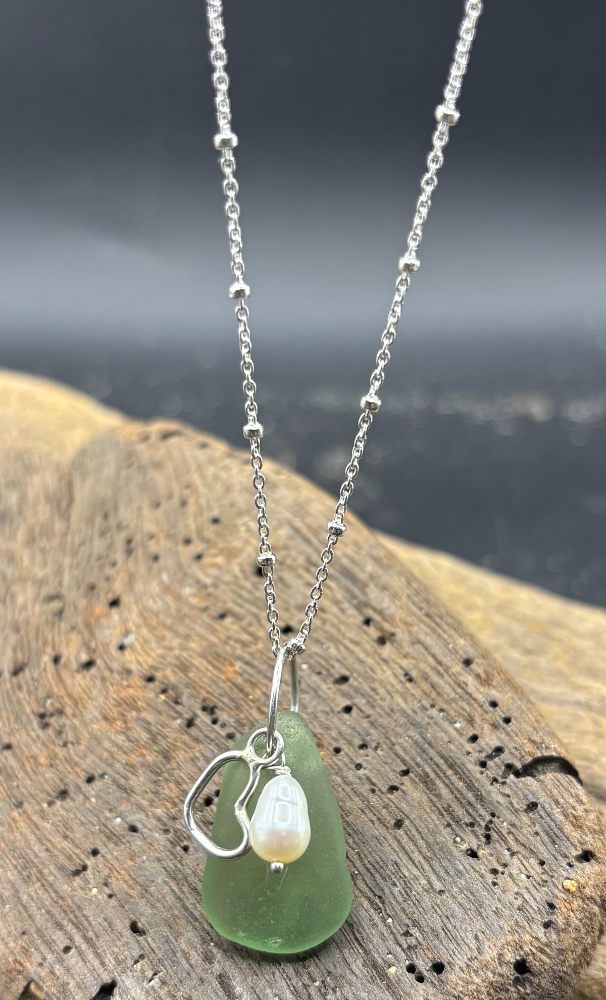 Sterling Silver, green sea glass and freshwater pearl.