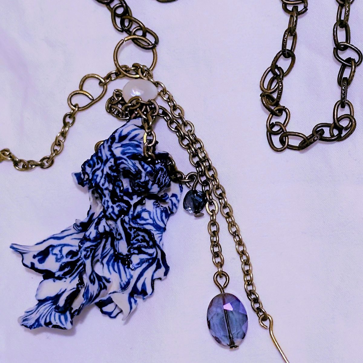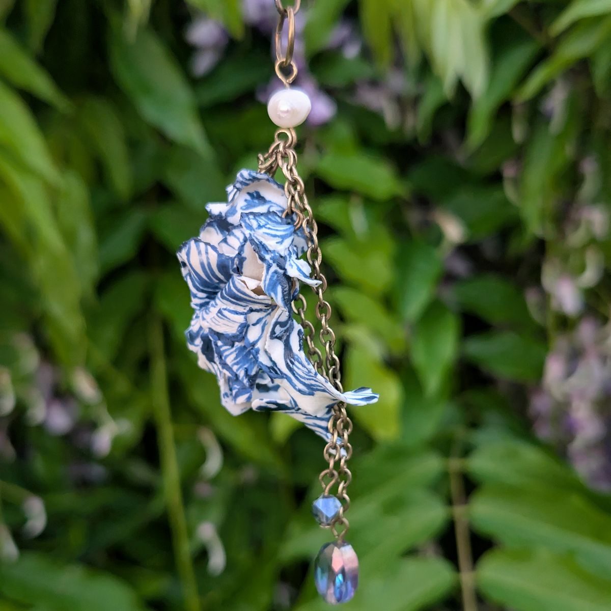 Porcelain, underglaze, metal, glass, freshwater pearl